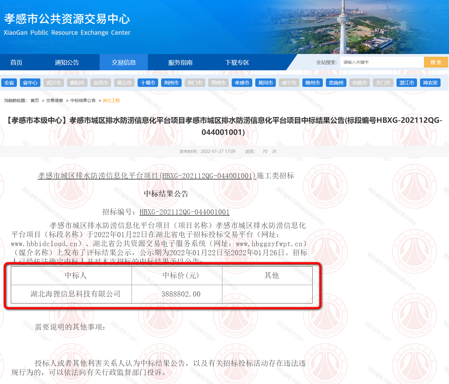 2022年1月,湖北海狸信息科技有限公司中标孝感市城区排水防涝信息化平台项目