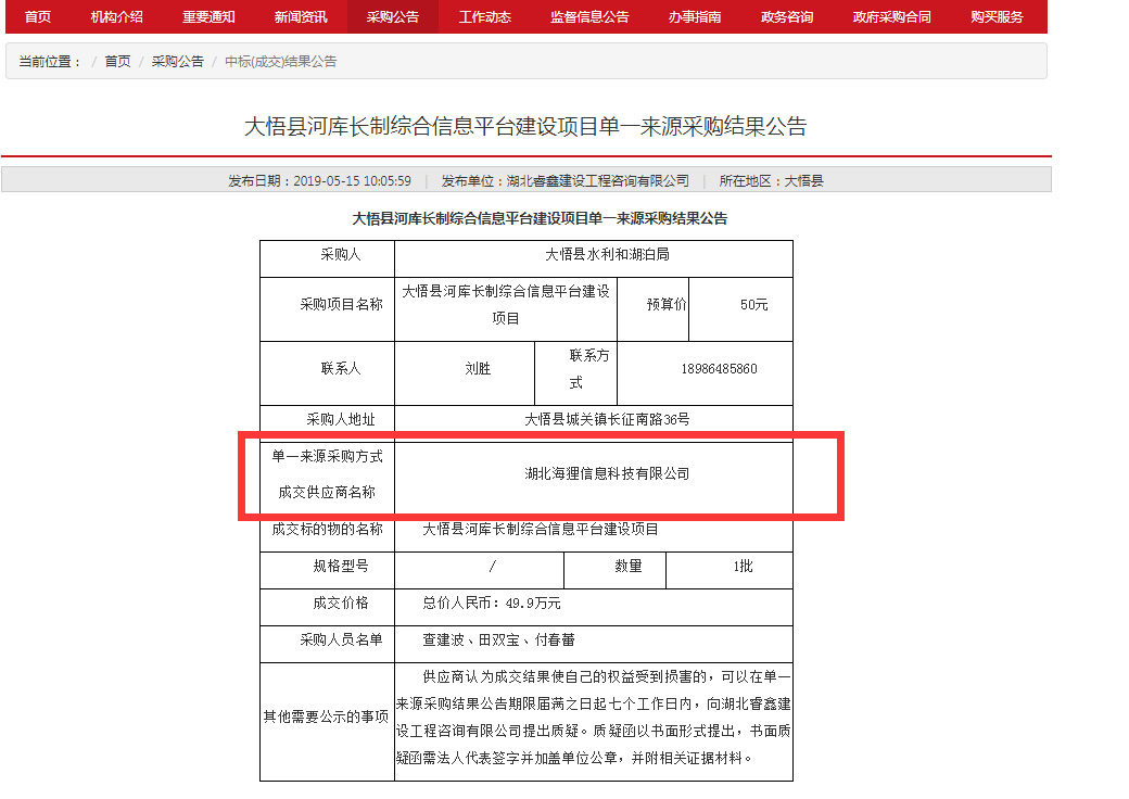 2019年5月,湖北海狸信息科技有限公司中标大悟县河库长制综合信息平台建设项目