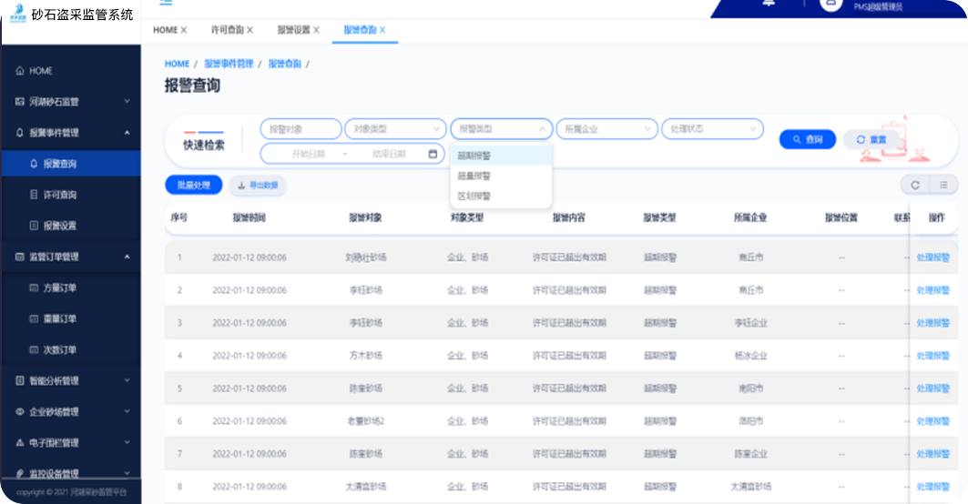 报警事件的管理,可对超期、超量、超界报警进行 处理,支持按对象名称、报警类型、处理状态、所属 企业、报警时间等条件对报警信息查询;采砂规划 许可证录入、查询与管理;超期、超量、超界报警 规则的设定。